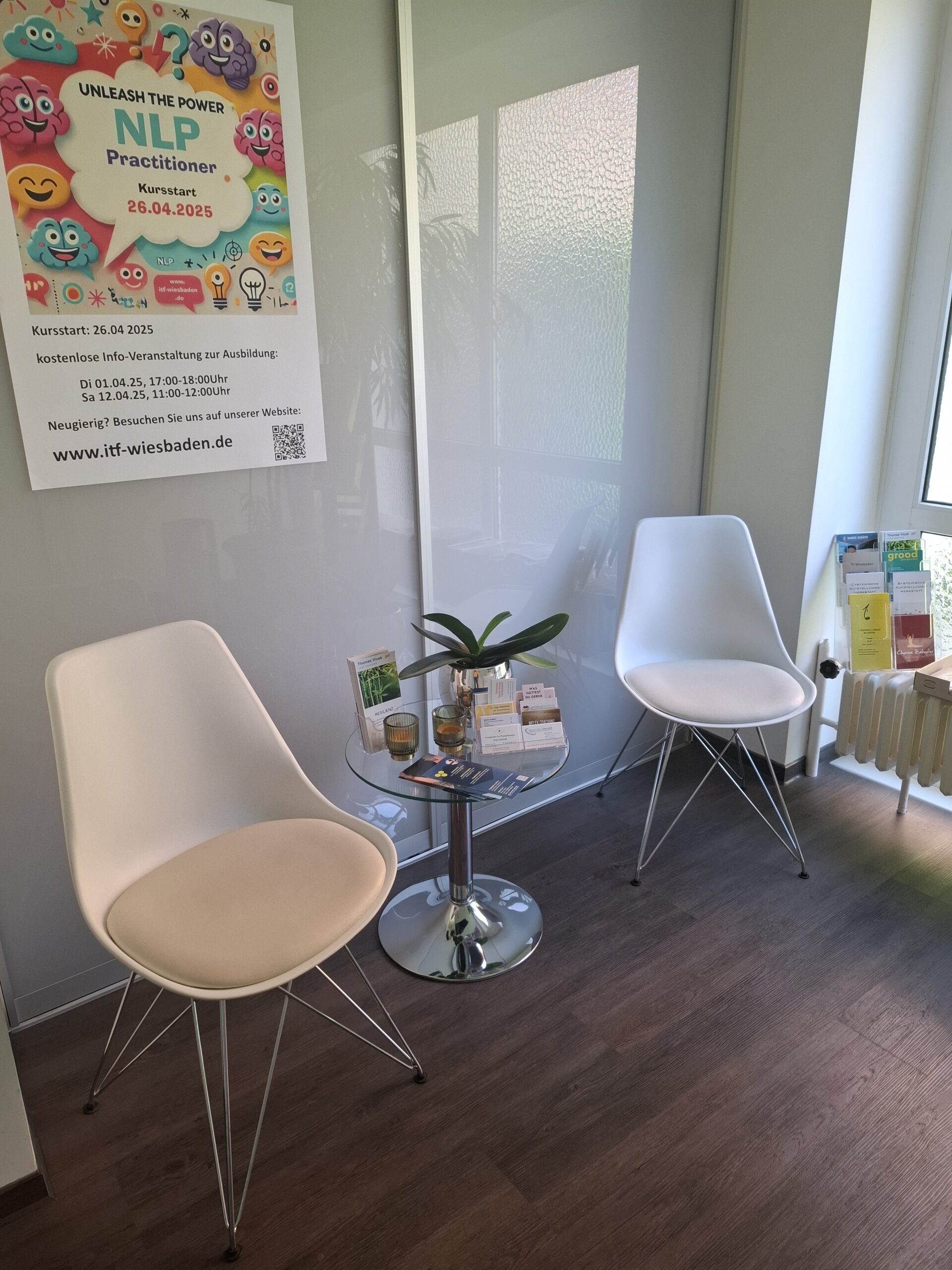 Sie finden mich in der Mainzer Straße 50, 65185 Wiesbaden. Die Beratungsräume befinden sich in einem Institut für interdisziplinären Therapie und sind gut erreichbar und mit einer angenehmen und ruhigen Atmosphäre. Die Praxisräume sind hell und freundlich gestaltet. Ich lege Wert auf eine entspannte Atmosphäre, in der sich Einzelpersonen, Paare und Familien wohlfühlen können.